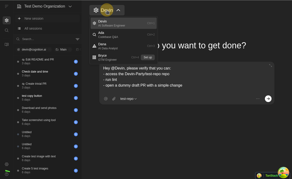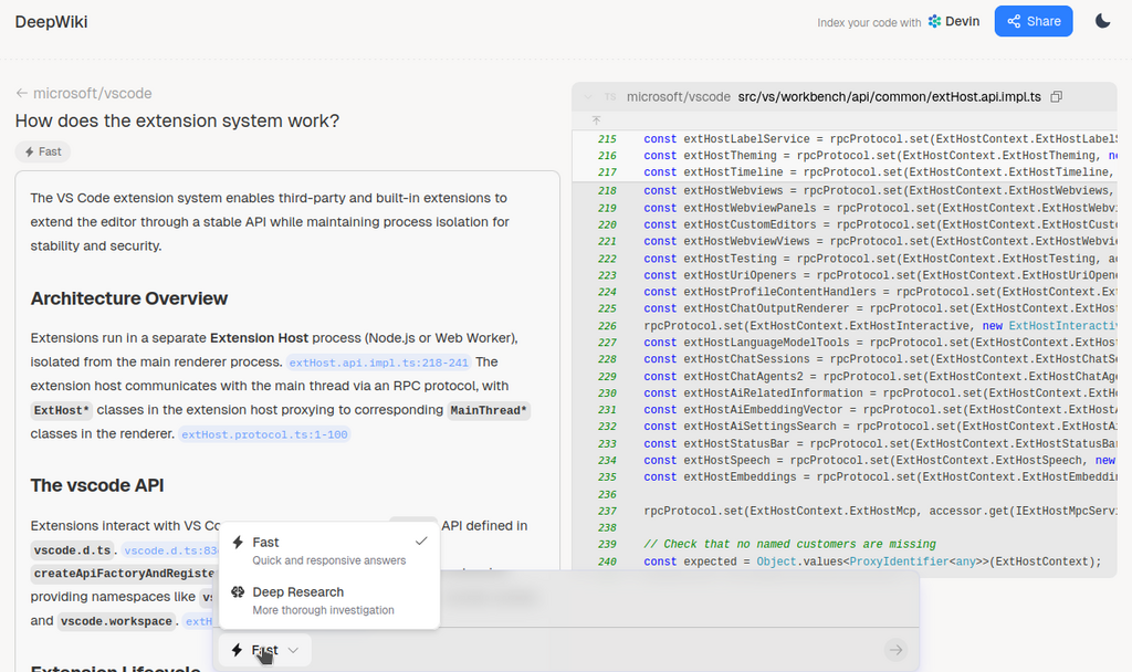 - At any point during a session, ask a question, and Devin will provide a DeepWiki-like answer, complete with code citations.